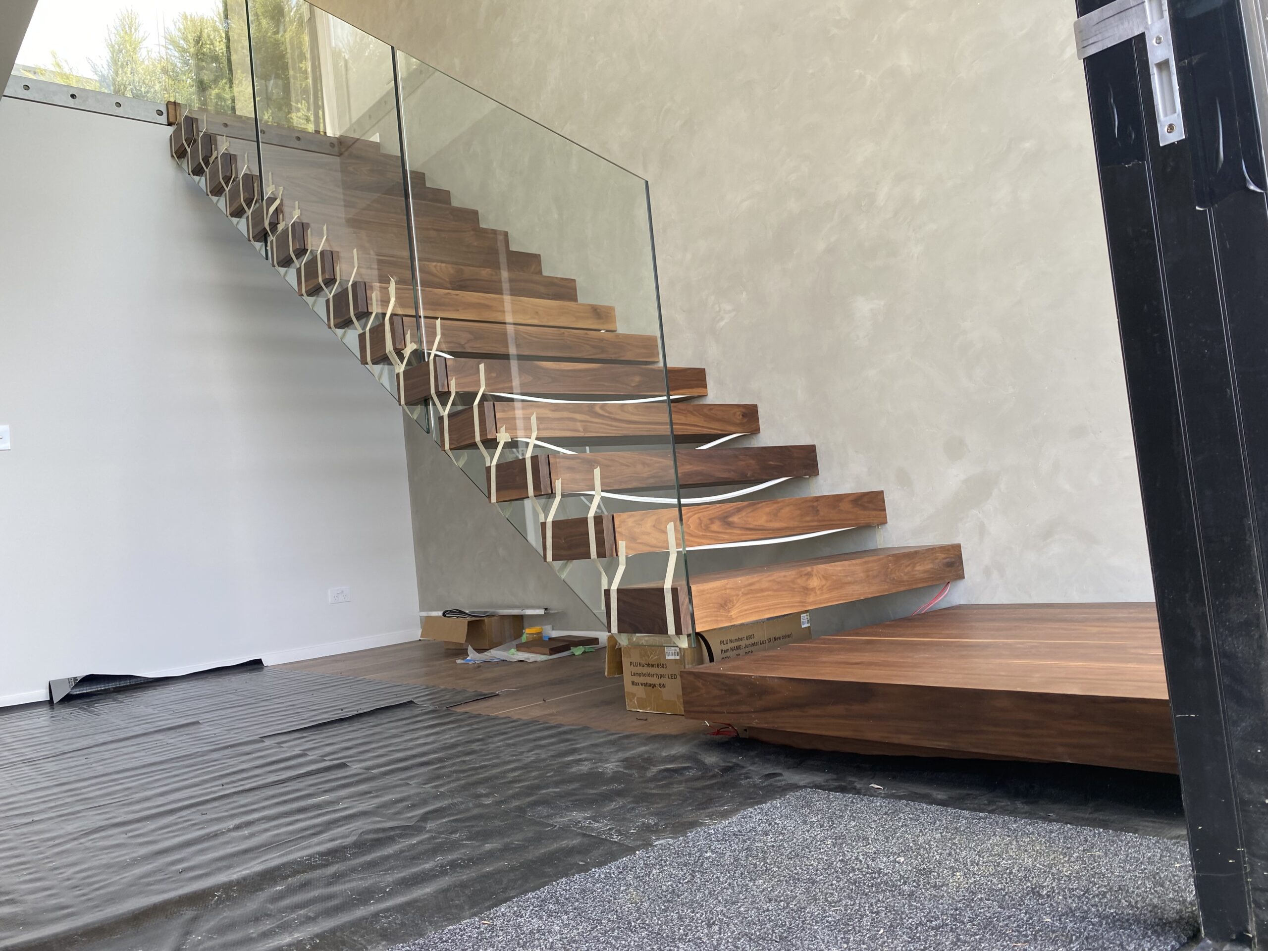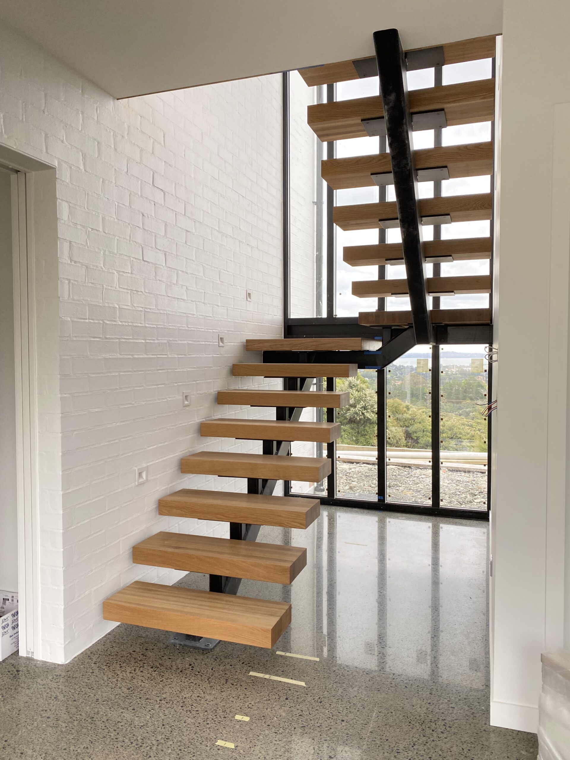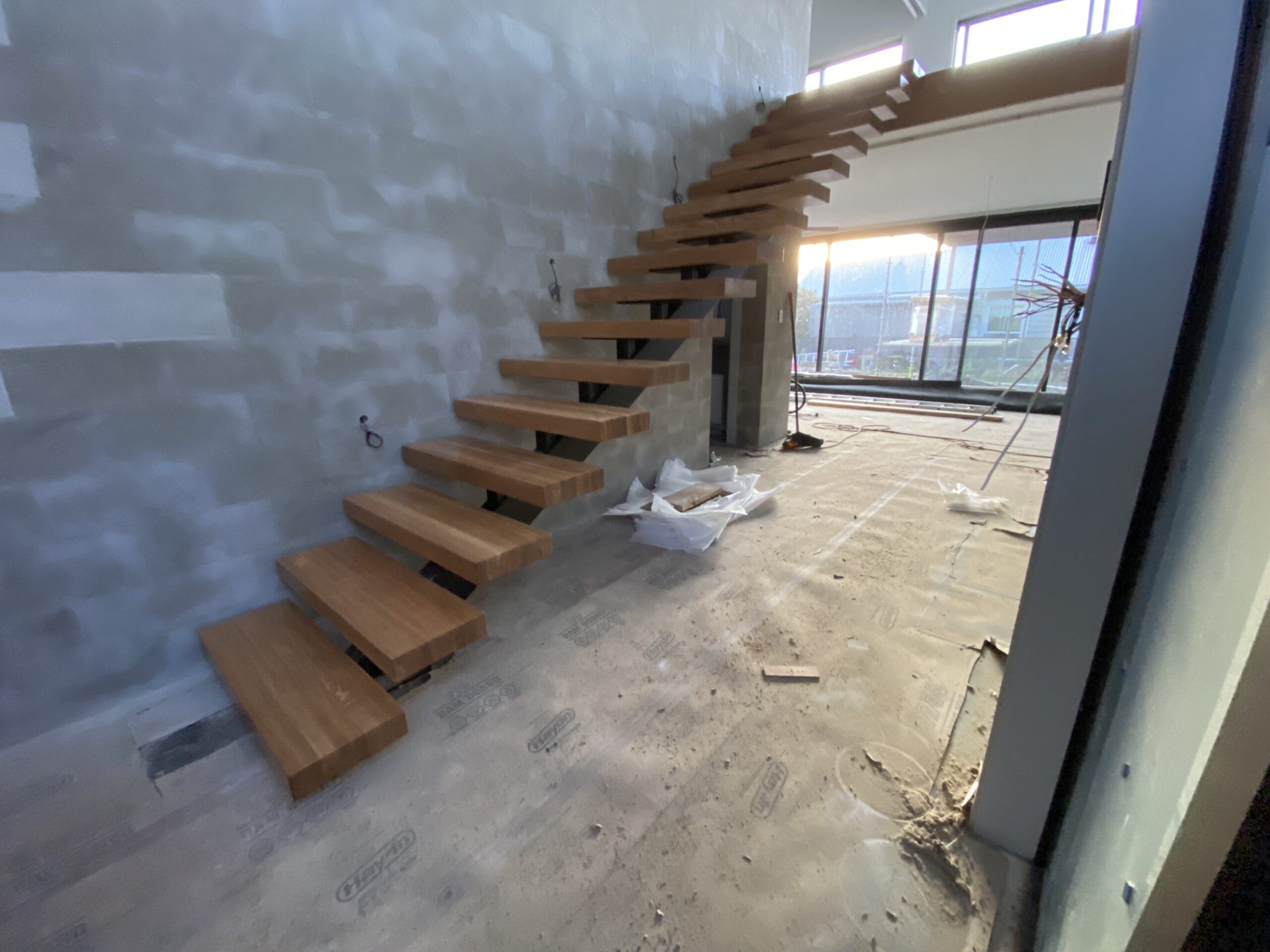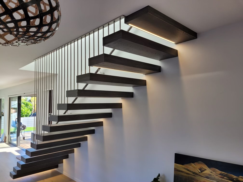 Feature stair steel stringer installations, solid timber feature stair tread installations, floating timber box tread installations and timber screen installations.