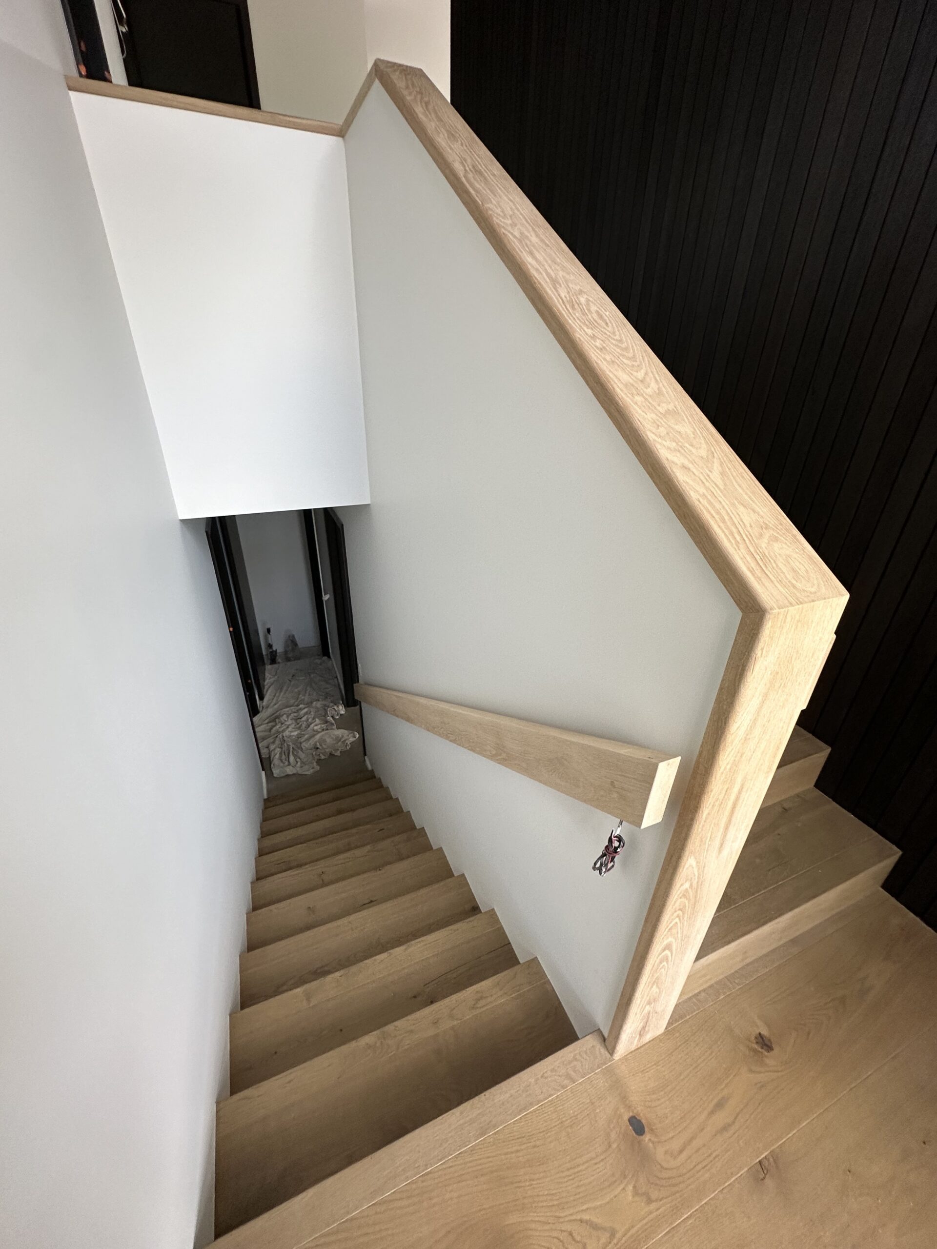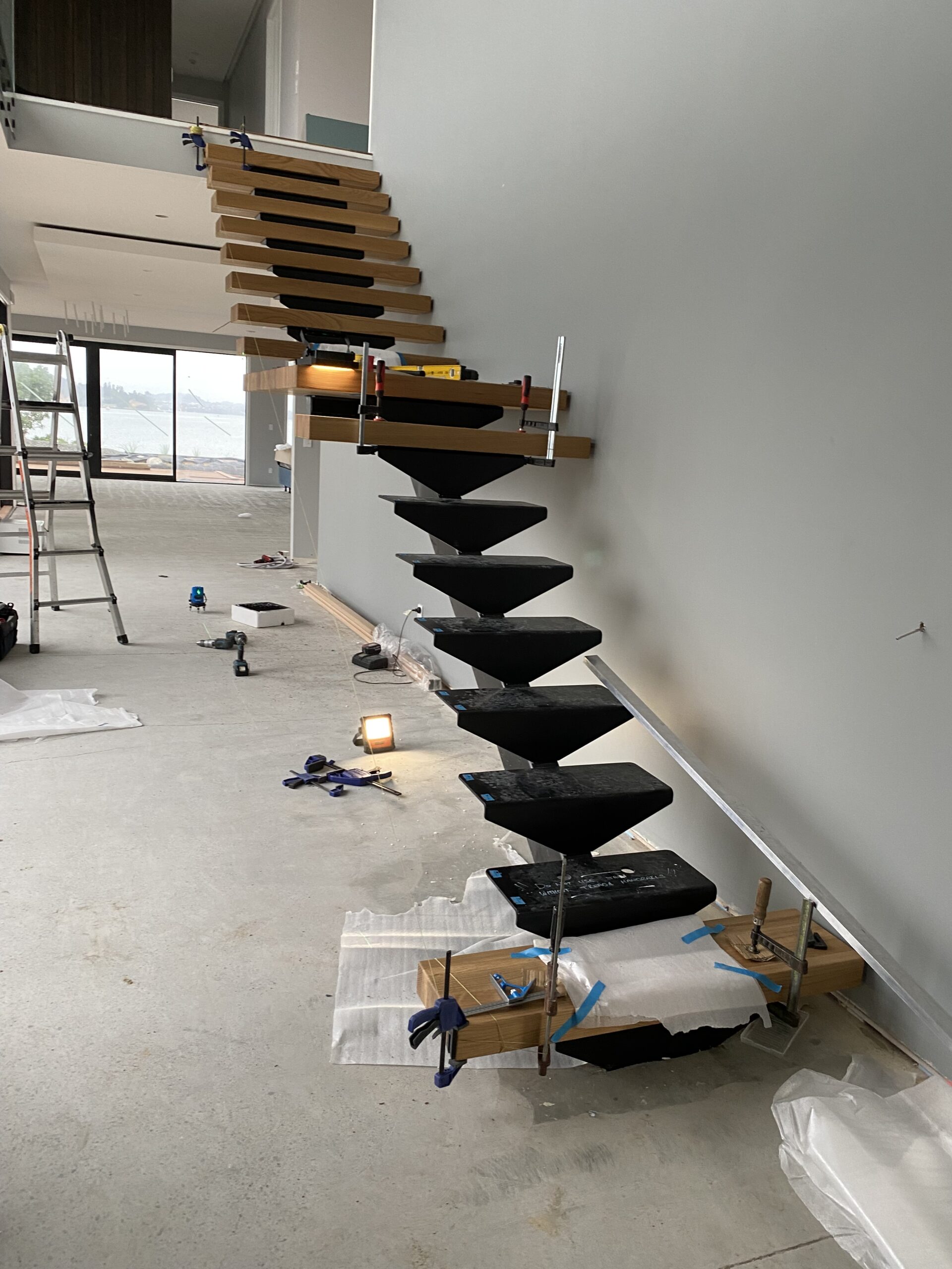 Solid timber Oak treads installed using a laser and levels for accurate alignment of tread ends ready for glass balustrade, then back to fit the timber covers and end caps to hide the glass fixings and also capping frame hand rail to the top edge of the glass all the way around.