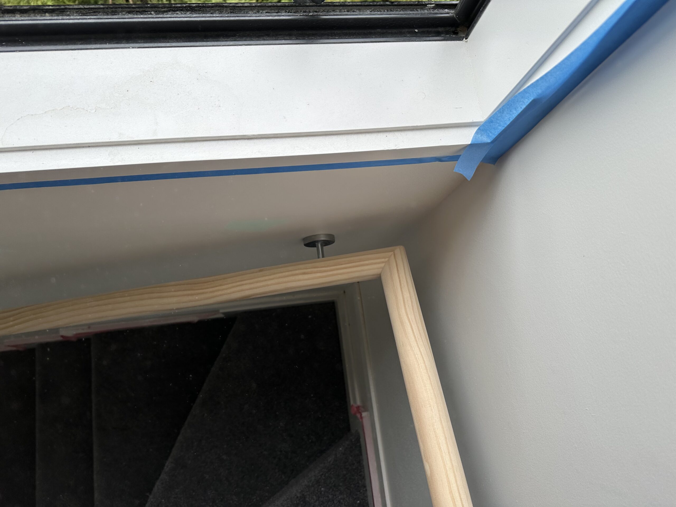 Solid timber Oak treads installed using a laser and levels for accurate alignment of tread ends ready for glass balustrade, then back to fit the timber covers and end caps to hide the glass fixings and also capping frame hand rail to the top edge of the glass all the way around.